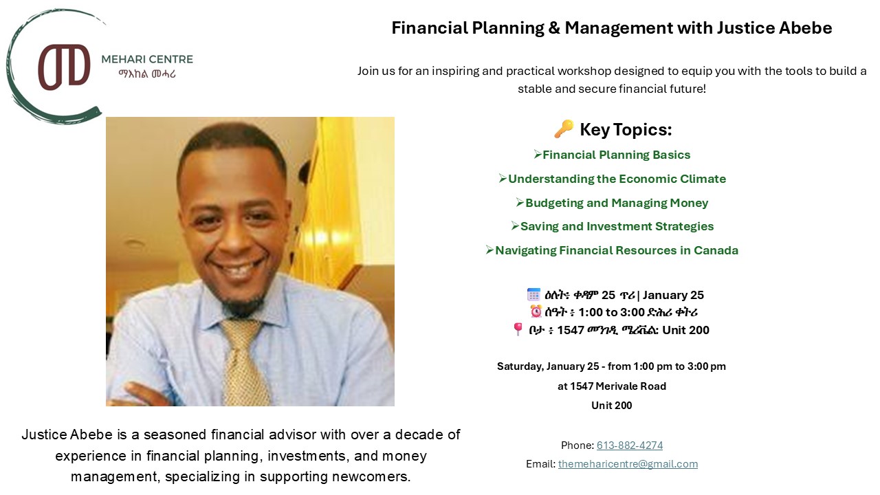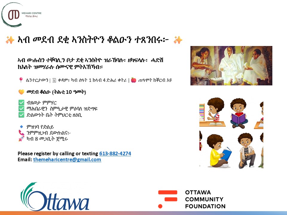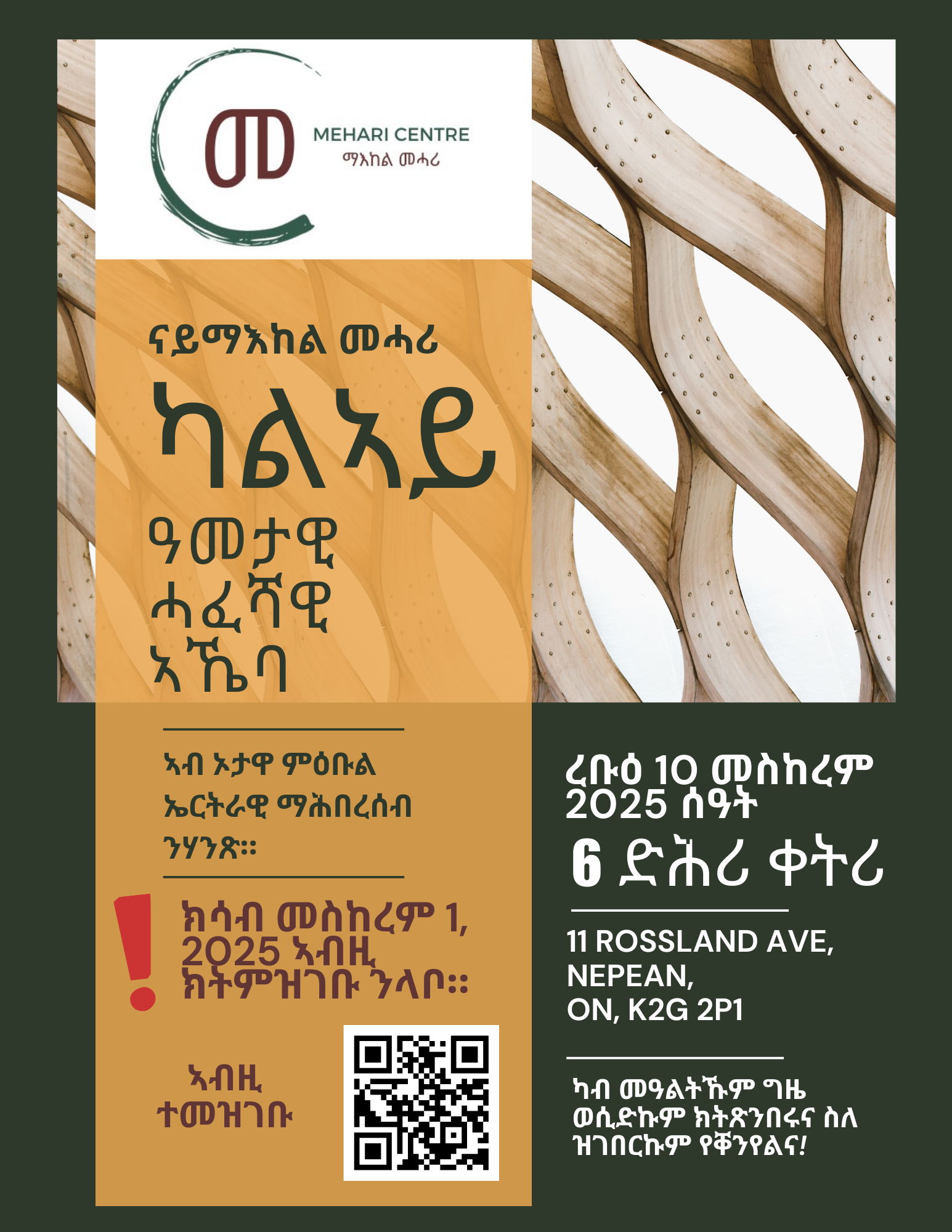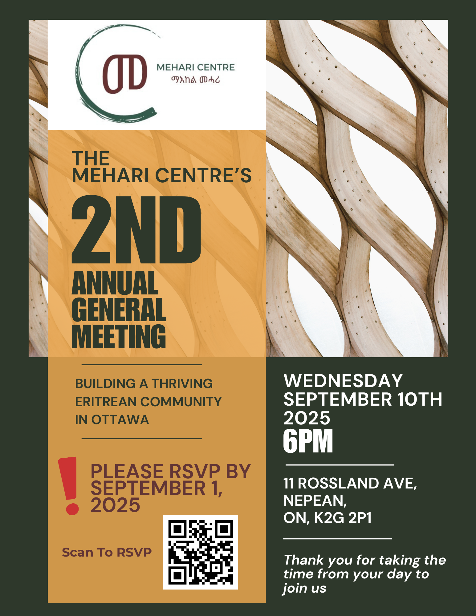 Past & Upcoming Events! The Mehari Centre offers a variety of workshops and events designed to support Eritreans in Ottawa. ← Our Values by Yodit Girmay | August 16, 2025 | AGM | 0 CommentsAGM RSVPPlease RSVP Online By September 1st View AGM Agenda BelowVENUE 11 Rossland Avenue AGENDADinner Enjera with meat and vegan options Read More Hello world! by Efrem Berhe | December 8, 2024 | AGM | 0 CommentsWelcome to WordPress. This is your first post. Edit or delete it, then start writing! Read More Subscribe for Event Updates Success! Name Email Subscribe