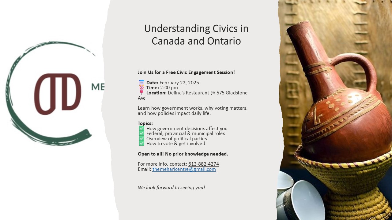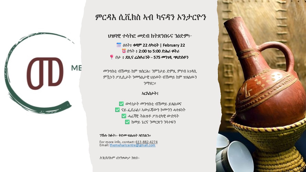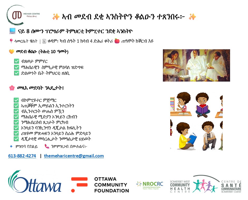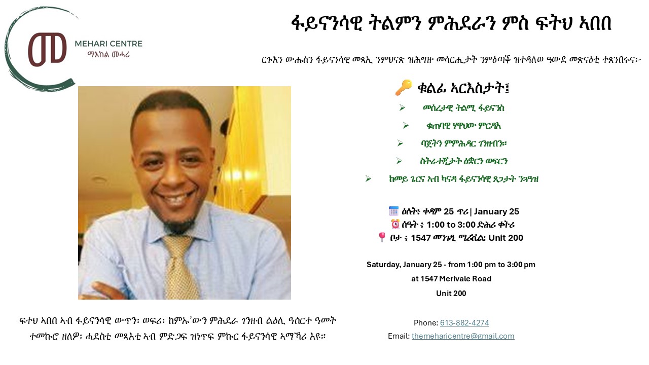 Past & Upcoming Events! The Mehari Centre offers a variety of workshops and events designed to support Eritreans in Ottawa. ← Our Values by Yodit Girmay | August 16, 2025 | AGM | 0 CommentsAGM RSVPPlease RSVP Online By September 1st View AGM Agenda BelowVENUE 11 Rossland Avenue AGENDADinner Enjera with meat and vegan options Read More Hello world! by Efrem Berhe | December 8, 2024 | AGM | 0 CommentsWelcome to WordPress. This is your first post. Edit or delete it, then start writing! Read More Subscribe for Event Updates Success! Name Email Subscribe